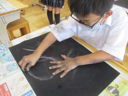 白い画用紙に黒のコンテで塗りつぶし、消しゴムを使って「消してかく!」をしました。