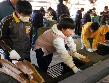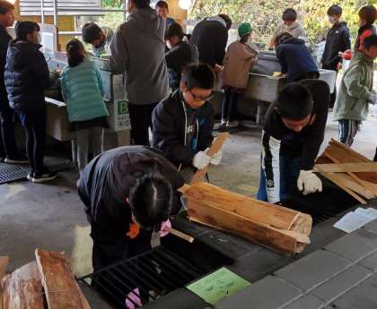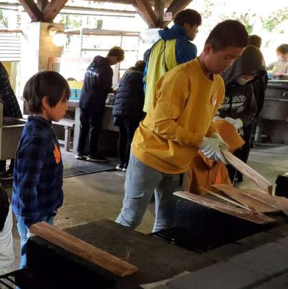 火の係は、薪を組んで準備をしています。鍋が運ばれたら点火します。