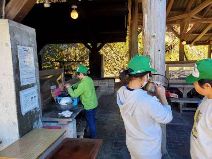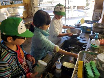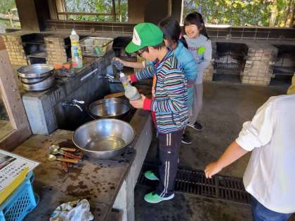 野外炊事が終わり片付けをしています。たわしで汚れをしっかり落とし、元通りになるまで磨きます!