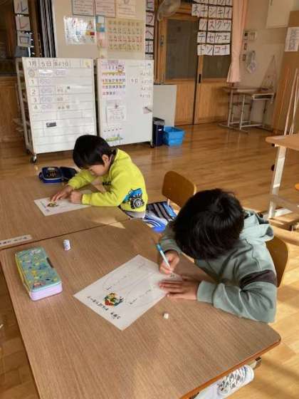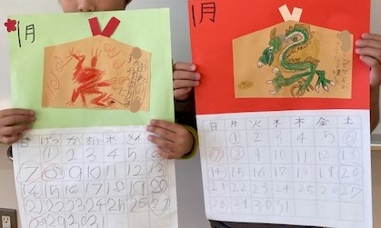 最後は、1月のカレンダーです。干支である辰(龍)を「描きたい」と言って好きな画像を選んでよく見て描いて絵馬にしました。願い事も書きました。今日、自宅に持ち帰りましたので、飾っていただければありがたいです。