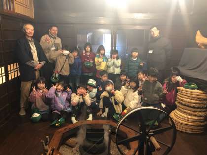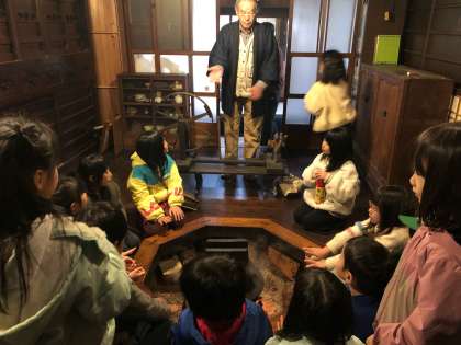 説明を受けたあとに、囲炉裏の近くで糸車を回す体験をしました。子どもたちは、日頃、経験できない体験ができて喜んでいました。