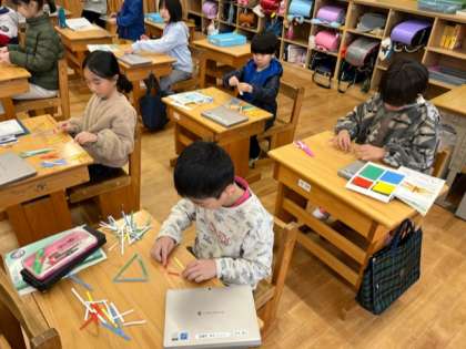 算数科では、三角形の学習をしています。長さのちがう棒を組み合わせて、いろいろな形の三角形を作りました。