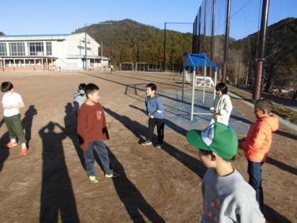 国語の学習では、遊びの本を読んで、楽しそうな遊びを友達に紹介する活動をしています。今日の放課後は、調べた遊びの中から「しまとり」という遊びをしていました。ルールを友達に上手に説明し、みんなで仲良く遊べました。