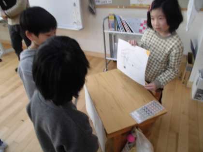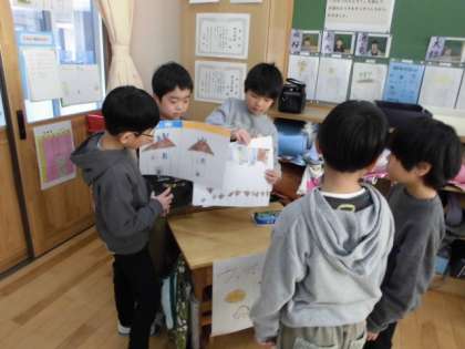 絵を使って紙芝居形式で紹介しました。1年生に伝わるように、言葉や文を選んで、発表の内容を考えていました。