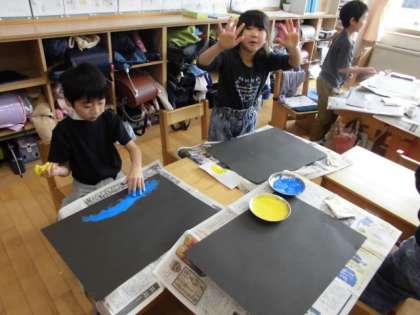 図画工作科の時間に、液体粘土を使って、絵を描く活動をしました。指や手を使って、絵の具を混ぜた液体粘土を伸ばし、絵をかきました。粘土の感触を楽しみながら楽しそうに活動をしていました。