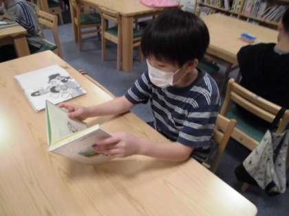 今日は、メディアセンターに行って本を読みました。「物語を読んでみよう。」というめあての元、いつもたくさん本を読んでいる子をはじめ、普段活字をあまり読まないと話していた子も活字の本を手に取り集中して読んでいました。