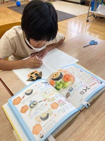 1枚目の写真は、こどもクッキングの本から調理してみたいメニューを選び、材料や調理方法を自分なりの文と絵でまとめています。