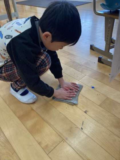2枚目の写真は、臨時で教室の掃除をした時、掃き掃除をしていた1年生の生徒がサッとぞうきんを絞ってきて床を拭き始めた時の写真です。絵の具で汚れているのを見つけてきれいにしていました。ホワイトボードの溝もきれいにしてくれました。