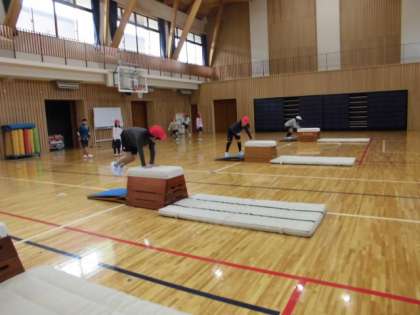 今日のとび箱の学習では、ステップの練習をした後、新しい技に挑戦する子が多くいました。とび箱の上で前転をしたり、横にしたとび箱で開脚跳びに挑戦したり、友達と技の出来を確認しながら頑張っていました。