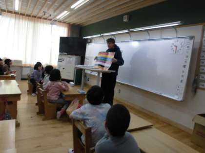 ALTのロバート先生に英語の絵本の読み聞かせをしてもらいました。その後、動物の名前や色を答えるゲームをしました。子どもたちは楽しそうに、動物や色の名前を英語で答えていました。