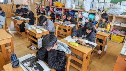 国語科「ウナギのなぞを追って」の学習では、自分で選んだ科学読み物を要約し、リーフレット作りをしました。選んだ科学読み物の大事なところを付箋にメモし、どの順番で文にしていくのかを考えている様子です。