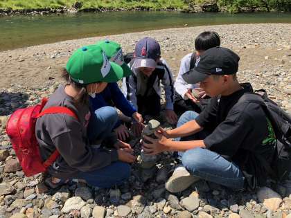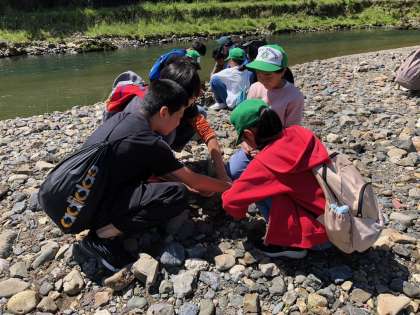 宇津峡公園に到着し、川の近くまで行き、まずは、グループで協力して石積みをしました。