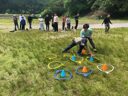 カレーを食べて片付けをして午後のレクレーションです。今回は4年生が主催のレクリエーションでビンゴリレーを楽しんでいます。