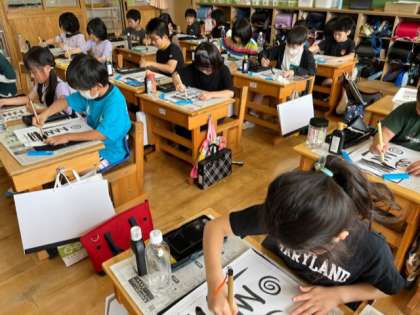 道具の置き方や筆の持ち方、書く時の姿勢などひとつひとつ確かめながら進めています。