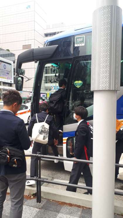 修学旅行中の9年生を乗せた新幹線は、予定通り博多駅に到着。これよりバスに乗車し、九州エリアを移動していきます。