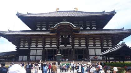 東大寺で見学しています。大仏の大きさに驚いています。