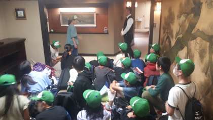 旅館に無事到着し、入館式を行いました。全員元気で食事を楽しみにしています。