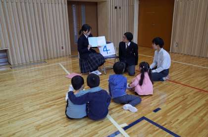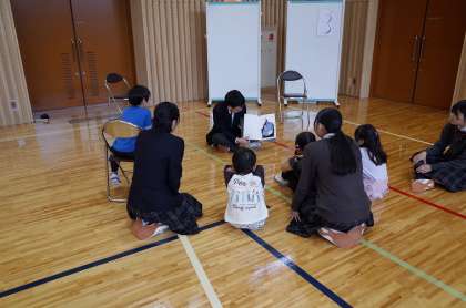 1年生は、9年生のお兄さん、お姉さんと遊ぶことができるので朝から楽しみにしていました。グループに分かれ、絵本を読んでもらい、楽しいゲームに参加させてもらい、みんな、大喜びでした。