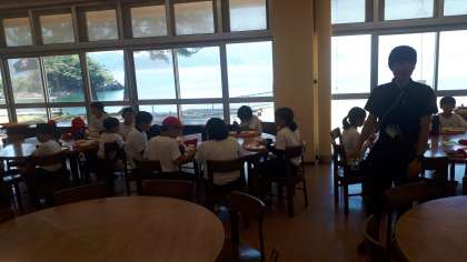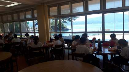 昼食はバイキングです。午後からの活動のために、もりもり食べています。