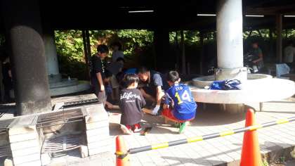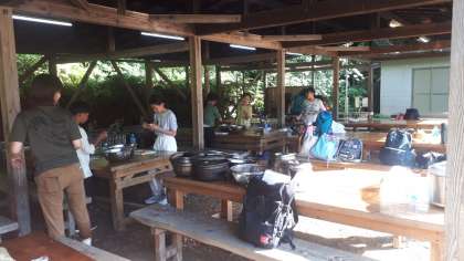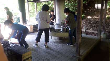 野外炊事で各班カレーを作っています。係に別れててきぱきと作業をしています。