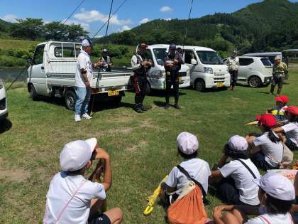 鮎の友釣り体験をしました。鮎を釣るときにはとても長い竿を使い、えさではなく鮎を針にひっかけ泳がせることで、縄張り意識の強い鮎が自分の縄張りに入ってきた鮎を攻撃してきたところを釣り上げると漁業組合の方から鮎の絵を使い説明していただきました。その後、グループに分かれて鮎の友釣り体験をしました。