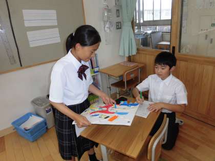 「切り分けた形から何つくる?」の鑑賞会を行いました。まずは、友達の作品で遊んでみました。子どもたちの楽しそうにしている姿がたくさん見られました。そして、鑑賞カードには、「工夫しているところ」や「楽しかったところ」などを書くことができました。