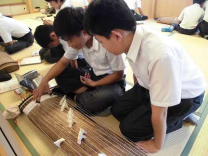 タブレットや教科書を見ながら13本の弦をはじいて、凛とした音を出していました。