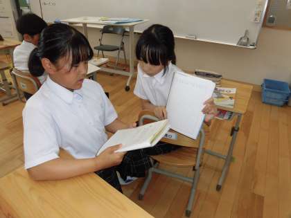 「公約数」「最大公約数」の見つけ方を考える学習をしました。2つの約数を書いて見つける方法や小さい方の数の約数から見つける方法などがあり、ペアで交流し話し合いました。話し合う中で小さい方の数の約数から見つける方法が早くできることが分かり、まとめることができました。
