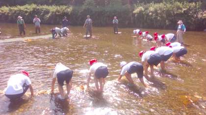 一人一人がわら束を持ち川下から川上に向かってわら束をこするようにゴリをわらむしろに追い込みました。子どもたちは「簡単そうに見えたが実際に体験するとしんどかった。」や「川の流れに逆らって進むので疲れた。」や「たくさんのゴリがむしろの方に泳いでいくのが分かった。」などの感想を言っていました。