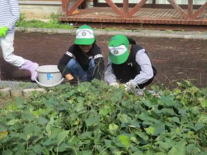 明日は待ちに待ったお芋ほりです。今日はその準備として、旧第一小学校にあるサツマイモ畑の草抜きをしました。子どもたちは、長く伸びたサツマイモのつるを見ながら「すごく大きくなってる!」「明日楽しみだな!」など、目を輝かせながら話していました。草抜きが始まると、サツマイモの葉の間から出ている草を丁寧に抜く姿が見られ、明日のお芋ほりを本当に楽しみにしているんだなと伝わってきました。