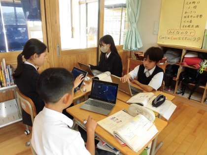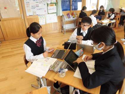 国語では、どうすれば学校生活をもっとよくしていけるかについて意見を出し合い、グループで話し合っています。グループのメンバーの考えを受けて、意見を考えなおしたり、司会を立てて、みんなの意見をまとめたりしながら活動に取り組んでいました。