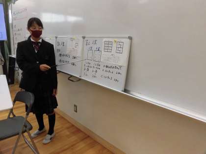 広さも人数も違う2つの部屋があり、どちらが混んでいるかを求める学習をしました。2つの数量のどちらかの数を揃えることで、比べることができ、答えを求めることができました。また、たくさんの子がみんなの前に立って説明をしていました。