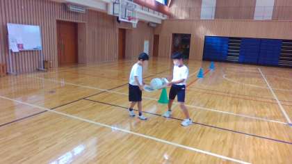 体育の時間に「体ほぐしの運動」をしました。新聞紙を引っ張る人と上に乗る人に分かれ、二人で息を合わて、新聞紙を破らないように進んでいく活動や、ボールを落とさないように運んだりする活動などをしています。