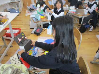 針金を回すとストローが上下に動く動きを見て、「この動きは○○に見えるな。」と想像力を働かせて思い思いの作品に仕上げています。
