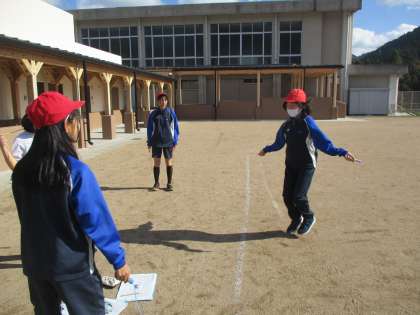 なわとびは短なわでは、いろいろな技に挑戦し、長なわでは、グループで組み合わせ技に挑戦しています。