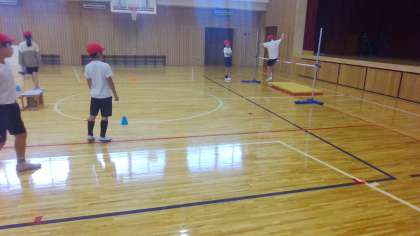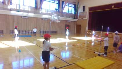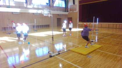 体育科で「高とび」の学習をしています。短い助走から強く踏み切って高く跳ぶ練習をしており、踏み切る位置や足の向きに気をつけています。お互いの跳び方を観察し、もっと高く跳ぶための方法を考えたりアドバイスをしたりしています。「ナイスジャンプ!」「ドンマイ!次はいけるよ!」といった励ましの声が自然に聞こえてきます。高跳びのフォームはまだまだこれからですが、リズミカルに助走し、高くジャンプすることを目指して頑張っています。