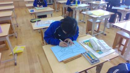 2学期から「ほり進めて刷り重ねて」の学習を始めています。ほり進み版画は、今まで学習した版画とは違い、ほりと刷りを交互に繰り返すことで、色を重ねた作品に仕上げていきます。子どもたちは、配色やほる順番をよく考えて、慎重に作業を進めています。