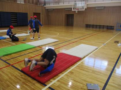 タブレットで友達の演技を撮り、確認しながら連続技と組み合わせ技に挑戦しています。