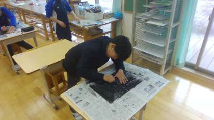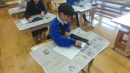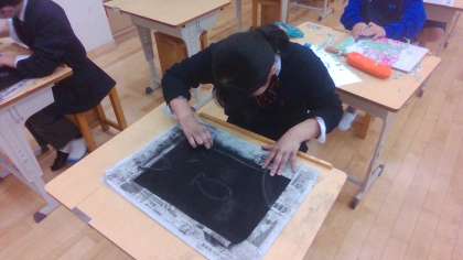 白い画用紙に、一面黒いコンテを塗ります。真っ黒な画用紙になれば、次は消しゴムで消して、デザインを表現していく学習です。子どもたちは、消しゴムを上手く使いながら、工夫してかいている様子がたくさん見られました。手を真っ黒にしながらも、とても楽しそうに取り組んでいました。