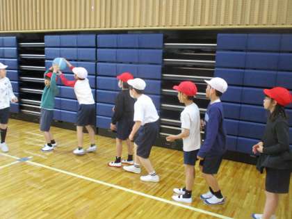 今日は3年生と一緒に体育館で活動しました。ボール送りゲームや鬼ごっこなど色々なゲームをクラスで協力して楽しそうにしていました。
