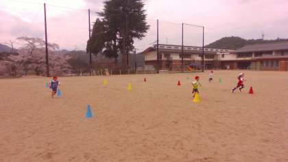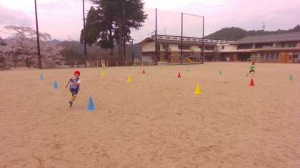 「リレーあそび」の学習が始まっています。カラーコーンをジグザグに走ったり、回ったりしながら、チームで競い合っています。チームのメンバーを応援する声や、楽しそうな笑顔が校庭に溢れていました。