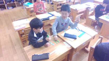「17+3」のような十の位に繰り上がる計算の仕方を考えました。子どもたちは、計算棒を使って考え、みんなの前で計算の仕方を説明することもできました。