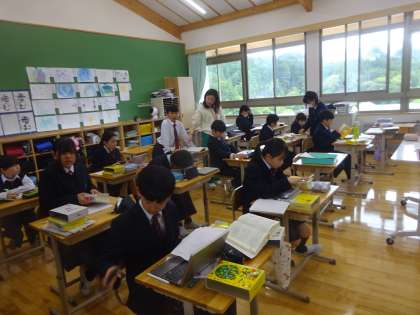国語科の学習で、漢字の形と音・意味について学びました。国語辞書や漢字辞書を使って、同じ音や形の漢字を調べました。集中して黙々と辞書と向き合う姿が印象的でした。