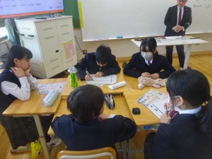 税理士の先生をゲストティーチャーとしてお招きし、租税教室をしていただきました。税金の仕組みについて教えていただき、学んだことをもとに実際に税金を運用していくことについて考えました。グループごとに考えを出し合い、一生懸命考える姿が印象的でした。