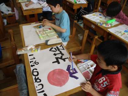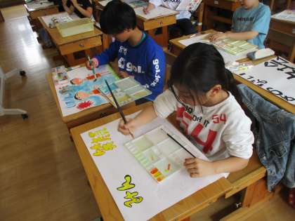 図画工作科の時間に人権ポスターを描きました。今日は絵の具を使いながらポスターの色をぬりました。