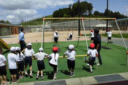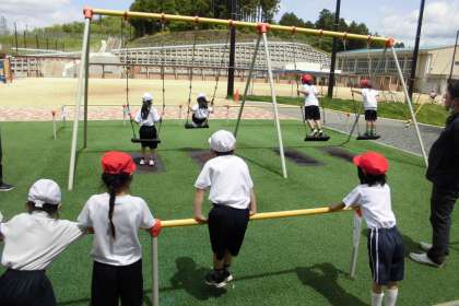 体育で遊具の使い方を学習しました。三点支持についての説明をしたあと、遊具を回って遊びました。