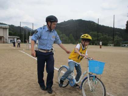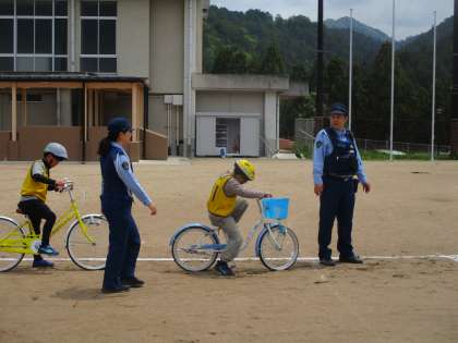 運動場では、保護者のボランティアの方にも協力いただいて、交差点や、横断歩道などでの安全確認の方法を細かく確認しました。後ろを向いたり、一時停止したりと子どもたちは真剣な表情で頑張っていました。