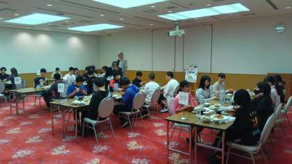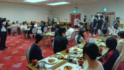 夕食を食べています。たくさん歩いたので、みんなお腹がペコペコです。