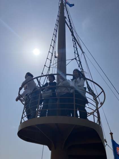乗船中です。さわやかな風が心地良いです。たくさんの島が湾のあちこちにあります。