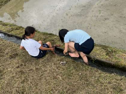 汚れた手足は、田んぼの脇の溝の水を使って洗い落としています。